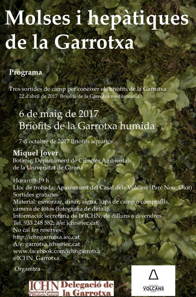 2ª SORTIDA MOLSES I HEPÀTIQUES DE LA GARROTXA BRIÒFITS DE LA GARROTXA HUMIDA 6 de Maig de 2017 de 9 del matí a a 7 de la tarda. Sortida gratuïta A càrrec de Miquel Jover, Botànic del departament de ciències ambientals de la Universitat de Girona