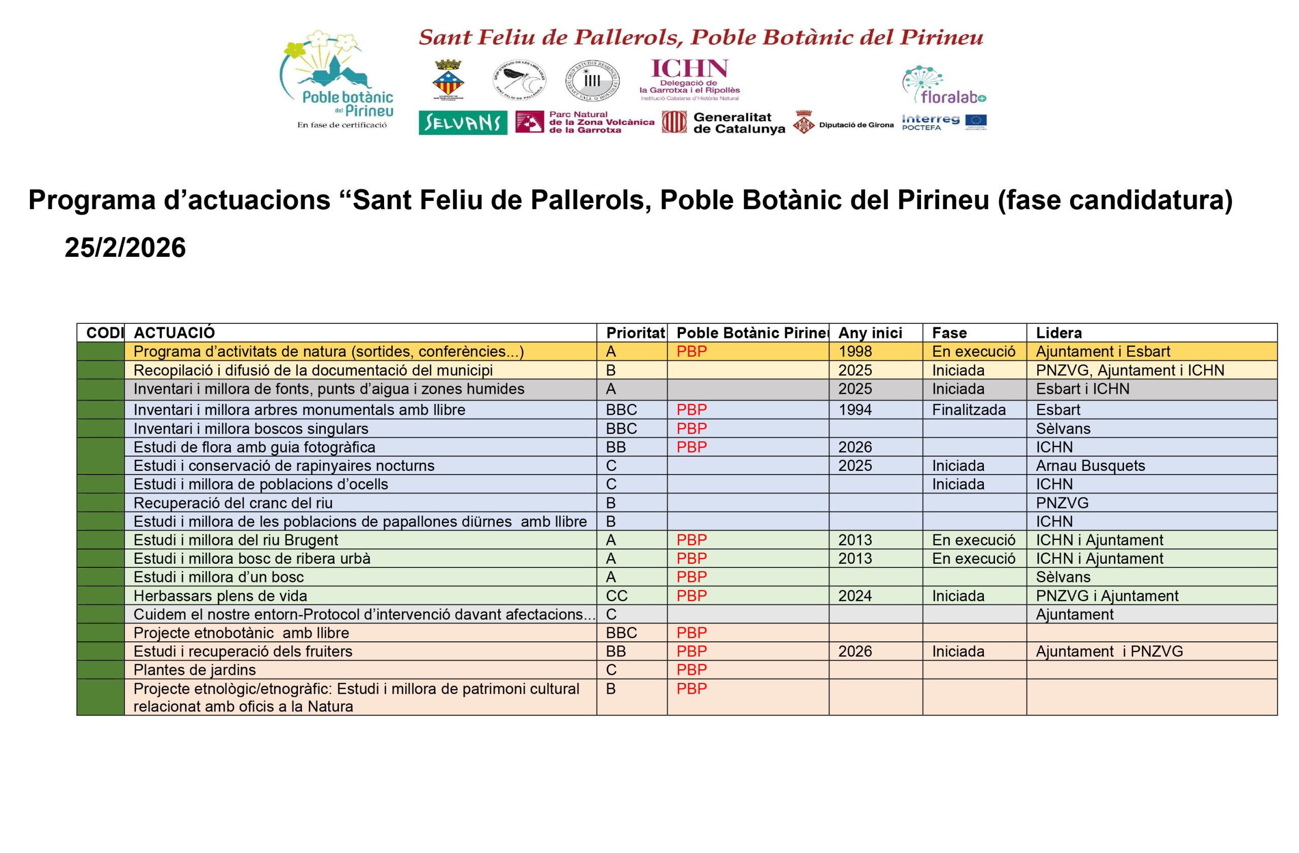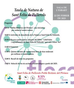 Sant Feliu de Pallerols arrenca com a candidata a l’acreditació Poble Botànic del Pirineu, amb una Taula de Natura celebrada el 22 de febrer de 2025, en la qual particulars, entitats i administracions van treballar en definir els projectes prioritaris sobre el patrimoni natural del municipi que volien engegar.